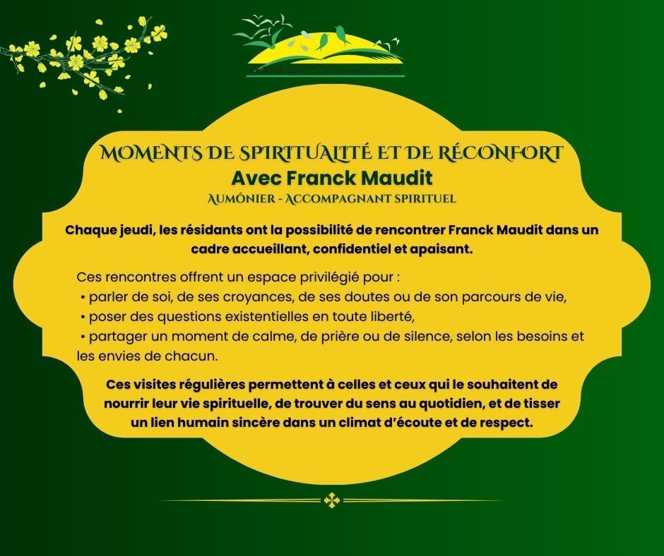 Par leur présence et leur écoute, un prêtre répondant et une aumônière accompagnent ceux qui le souhaitent: résidants, familles et collaborateurs dans leur cheminement personnel.